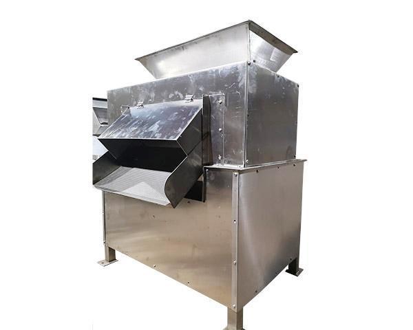 工作原理:飛刀繞自身軸線在固定不動的底刀間隙內(nèi)旋轉(zhuǎn),從而使果蔬破碎,轉(zhuǎn)子上有四組飛刀,底刀為一組,視果蔬種類不同,出料斗有斗式和管式兩種型式。在進料斗上部加上緩沖裝置,可得到粒度更細(xì)的物料。