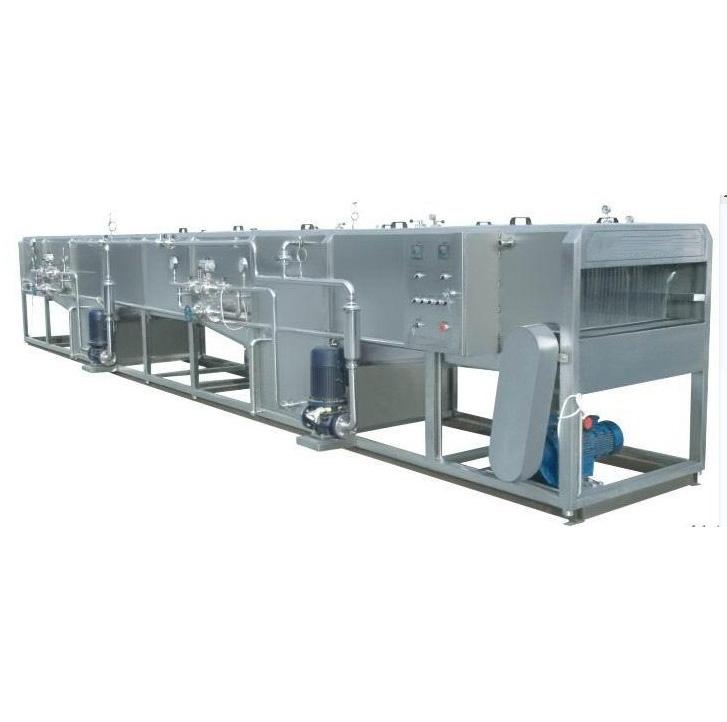噴淋殺菌機,采用循環熱水噴淋殺菌、溫水預冷、冷水冷卻等多段處理,具有節水、節熱能等優點。